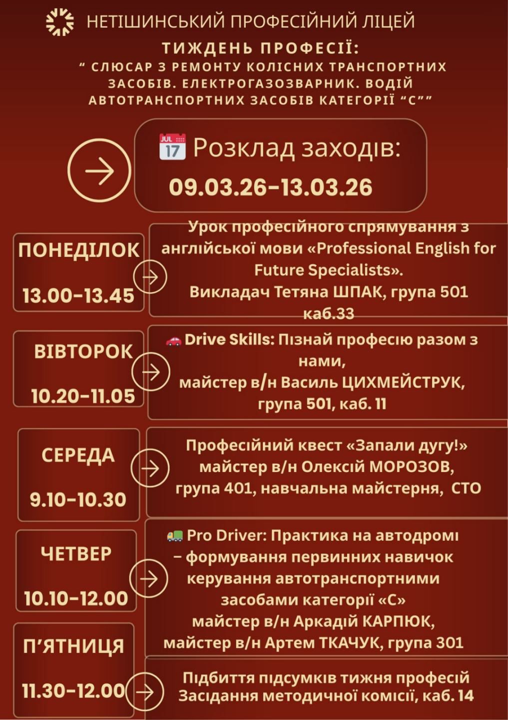 Тиждень професії у ліцеї! У нашому закладі розпочинається Тиждень професії: «Слюсар з ремонту колісних транспортних засобів.Електрогазозварник. Водій автотранспортних засобів категорії «С»». Упродовж тижня для здобувачів освіти груп 301, 401 та 501 відбудуться різноманітні заходи. Мета проведення тижня — поглиблення професійних знань, розвиток практичних навичок та підвищення інтересу до обраної професії. З розкладом проведення заходів […]